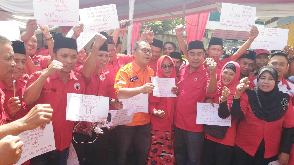 Setelah mengembalikan formulir kepada Ketua Tim Penjaringan Raisuljaiz, ratusan kader PDI Perjuangan yang terdiri dari Pengurus Anak Cabang dan Ranting di halaman secretariat menunggu turunnya DP sambil memegang kertas yang bertuliskan “Saya Indonesia, Saya Pancasila, Saya Makassar dan Saya DP. (RJ)*