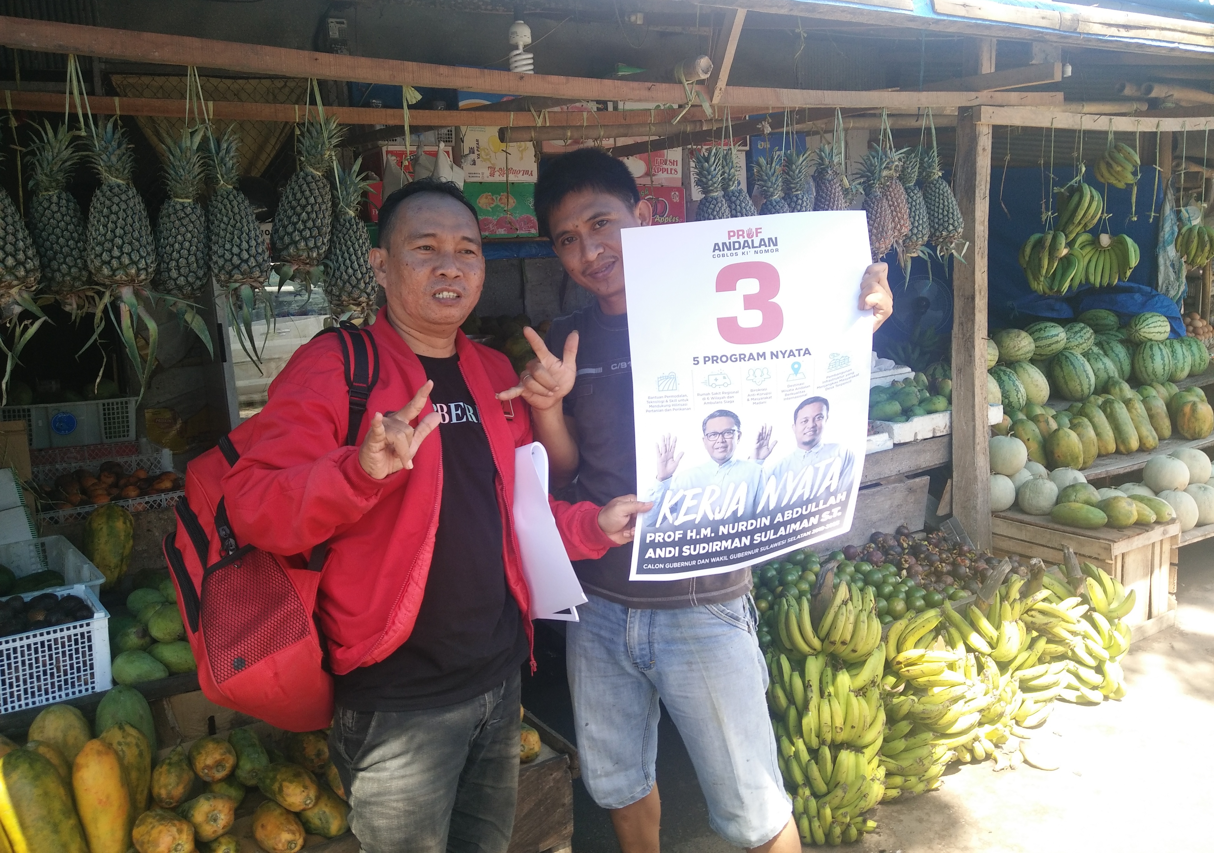 Sementara itu H. Bustami yang juga penjual barang kelontongan di Pasar Pa baeng baeng yang melihat kedatangan tim dari PDI Perjuangan membagi brosur sambil mensosialisasikan program prof andalan dengan sedikit memaksa tim untuk masuk di kios dagangannya sambil menyuruh istrinya untuk menyiapkan minuman dingin sambil berucap barusan kali ini ada timnya prof andalan datang kesini, saya berharap ketemu langsung sama Prof Nurdin, meskipun saya tidak kenal beliau tapi saya tidak ragu untuk memilihnya karena beliau orang baik dan santun serta terbukti kinerjanya selama ini, ucapnya.