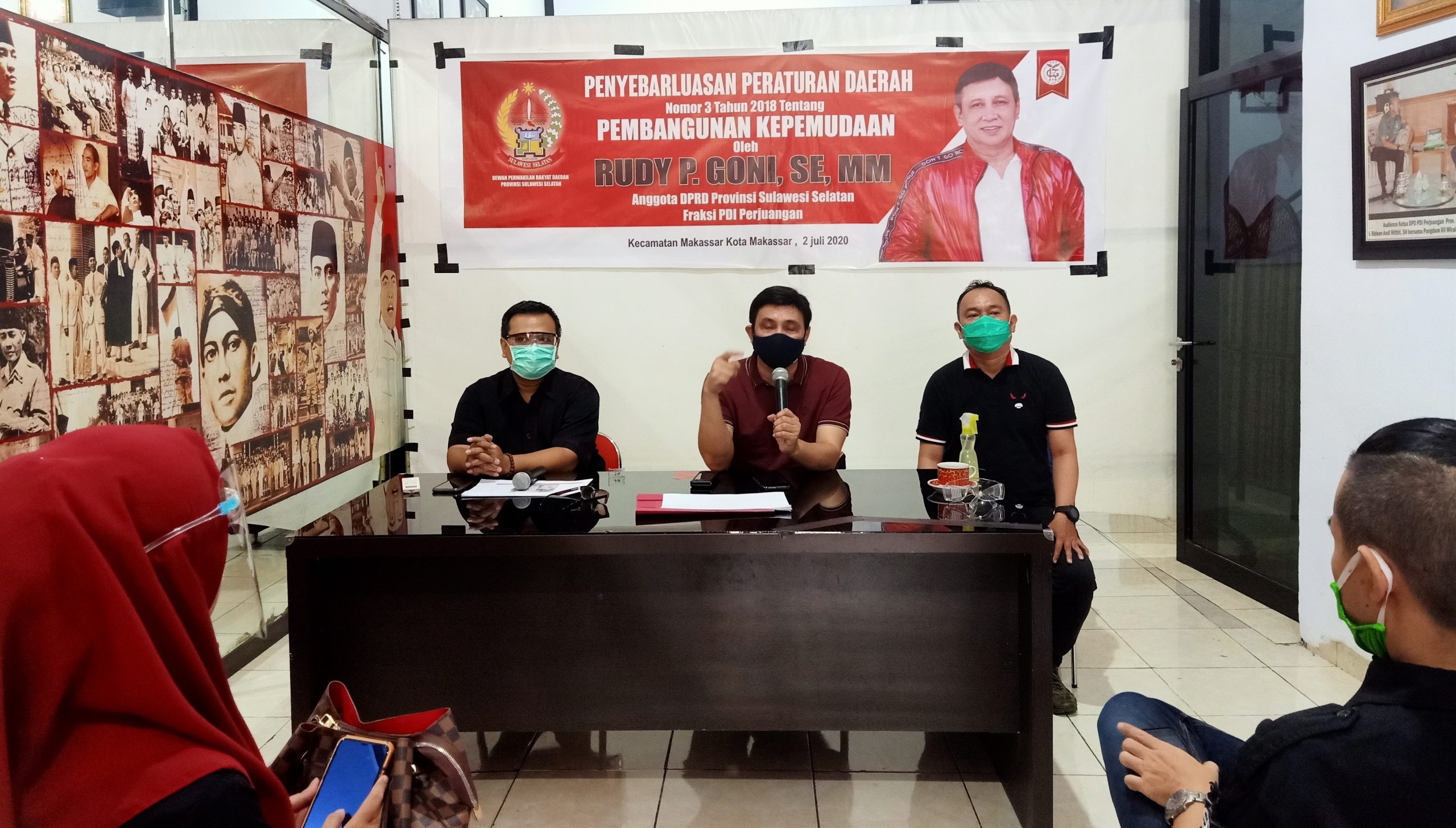 SUPERMAKSS.COM – Sosialisasi Peraturan Daerah Nomor 3 Tahun 2018 tentang Pembangunan Kepemudaan dilakukan oleh salah satu legislotar DPRD Provinsi Sulawesi Selatan Rudy P. Goni di Jalan Bawakaraeng Kota Makassar, Kamis (02/07/2020).