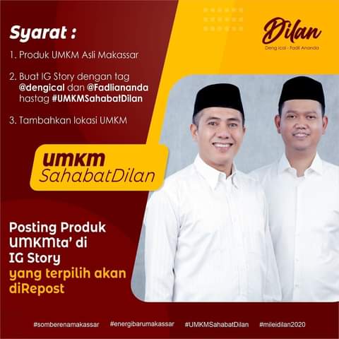 Bila ingin berpartisipasi dalam program UMKM Sahabat Dilan, caranya sangat mudah. Persyaratannya, produk usaha itu asli Kota Makassar. Selanjutnya posting produk usaha itu dengan membuat Instagram (IG) story dengan tag @deng.ical dan dokter @fadliananda, lalu tambahkan lokasi UMKM.